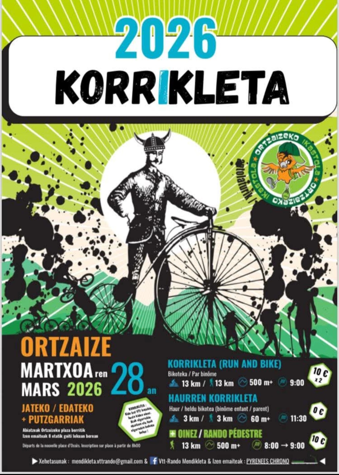 Ongi etorri Ortzaizeko Ikastolarat! 2025ko Ikastolako sartzea irailaren 1an izanen da. Ongi etorriak berriz haur eta familia guzieri elgarrekin partekatuko dugun ikasturte berri hunentzat! EUSKARAZ EREIN, HAZI ETA LORATU! Hurrengo ekitaldiak KORRIKLETA 2026 Martxoaren 28 an Ortzaizen – Korrikleta (Run & Bike) 13 kms / 500m+ / 9h00 – Haurren Korrikleta (Haur eta Heldu bikotea) 3 kms / 60m+ / 11h30 – Oinez 13 kms / 500m+ / 8h > 9h